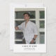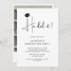 This modern minimal black and white graduation party invitation features "He did it" in stylish script, a grad cap, simple typography, and an option to add your photo at the back.