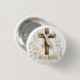 This Easter themed button has a cross with the words "He is Risen" in brown.