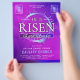 Celebrate the power and promise of Resurrection Sunday with this vibrant “He Is Risen” Easter Church Flyer. Designed with a bold purple and pink gradient background, striking crown of thorns centerpiece, and elegant typography, this flyer beautifully captures the message of hope, victory, and new life in Christ. The dynamic layout highlights your church name, event date and time, guest speaker, and service details in a clear and eye-catching format that’s perfect for Easter outreach.