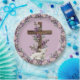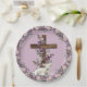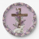 These Easter themed napkins have a pink and purple spring flower wreath borders along the edge on a bright lavender background. In the centre is a cross with a Lamb and a spring floral bouquet.