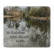 Peaceful scene of trees reflected in calm water, and words from Psalm 23: "He leadeth me beside the still waters."