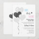 This design features gender reveal theme with "he or she, what will baby be?" with heart shaped balloons in modern black, white and grey theme with subtle pink and blue accents. Perfect for minimalist lovers.