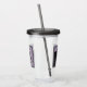 This acrylic drink tumbler with straw and lid has an illustration of the head and wing of a black crow on a purple background with an ornate black border. customize your text with the template.