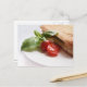Postcard of healthy Italian food consisting of a panini sandwich and a tomato, green basil leaves and mozzarella cheese on a white background.