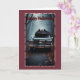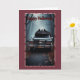 Get into the spooky spirit with this eerie Halloween greeting card, featuring a classic black hearse rolling down a misty, leaf-strewn road. The card's design captures a chilling yet festive atmosphere, perfect for celebrating the haunting season. Atop the hearse, a menacing bat with a skull face adds a touch of frightful fun, while the bold "Happy Halloween" greeting in black and red sets the perfect tone.