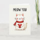 This card shows a chubby white cat centered on a soft off-white background, looking straight ahead as if locking eyes with someone it adores 🥰. A bright scarlet scarf is tied around its neck, with two little fringed ends that add a cozy, cuddly touch. The cat’s paws wrap around a large deep red heart held close to its chest, making the affectionate gesture the main focus ❤️. Its face is kept simple with tiny black dot eyes, a small brown nose, a gentle smile, and rosy pink cheeks that read like a shy blush. Light shading and faint outlines give the fur a soft, velvety look without adding heavy detail. Near the top, the phrase “MEOW YOU” sits above the cat in thick black hand-drawn letters, clearly standing out against the pale background. The palette stays mostly creamy whites and warm browns, letting the reds of the scarf and heart pop. The scarf’s knot and the heart’s rounded edges are drawn with smooth curves and minimal lines.