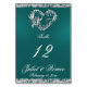 This romantic design features an elegant teal background with glitter borders, a heart and placeholders for the table number, couple's names and date of event. Available in several colours for your wedding theme. (Glitter is simulated in the artwork). Designed to coordinate with the Romantic Scroll Hearts & Glitter Wedding Collection. To change details, click «Personalize». To move the text or change the text size, font, or colour click «Click to customize further».