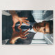 This puzzle has a man making heart hands on it.