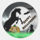 A grey metallic background design with a pumpkin, bats, the black silhouette of a rearing horse and a cat. A great Halloween item for your trick or treaters!
