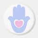 Soft blue Jewish & Muslim symbol designed to ward off the evil eye. Hand of Fatima or Miriam hamsa. Pink heart in palm. Two colour vector design.