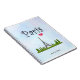 A personalized notebook with a whimsical drawing of the Eiffel Tower in the background surrounded by green trees. A pink heart and Paris typography add a girlish flair.