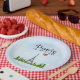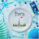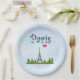 Paper plates with a whimsical drawing of the Eiffel Tower in the background surrounded by green trees. A pink heart and Paris typography add a girlish flair.