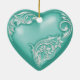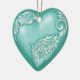 Beautiful heart shaped ornament with silvery white flourish scroll on turquoise / soft teal blue, perfect for hanging anywhere any time of the year. Hang on the wall, from a gift or even around the neck of a bottle of wine. Perfect for Mother's Day, Valentines Day, birthdays, anniversaries and more.