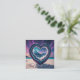 An ice sculpture shaped like a heart stands prominently on a snowy beach. In the background, the Northern Lights illuminate a serene mountain landscape.