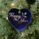 Lovely, ceramic heart-shaped ornament, features message, "Happy New Year", on a blue background, with holly. Design is on both sides of this New Year ornament. Use yourself or give as a gift for the New Year!