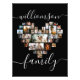 Heart-Shaped Photo Collage Family Script Caligraphy, Create a stunning Photo Enlargement featuring 35 of your most cherished memories! Our heart-shaped photo collage template beautifully showcases your pictures in a mix of portrait, landscape, and square Instagram formats. Simply upload your photos in rows, from top to bottom, and enjoy a design with a sleek black background and the word "family" in elegant script. Want to match your home decor? Click "customize further" or message us for assistance in selecting a different background colour. This Photo Enlargement makes the perfect addition to your family photo collection and is a great gift idea for weddings, Graduation, Christmas, Holidays, anniversaries, or engagements.