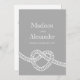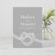 Simple modern graphic sketch heart shaped tying the knot wedding invitation in timeless grey and white. Tying the knot is classic symbol to show the union of two into one intertwined lasting unity. Simple knot sketch graphic and design by Sarah Trett.