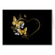 Gold heart shaped frame, decorated with gold, jewellery and white butterflies on black background.