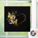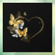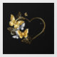 Gold heart shaped frame, decorated with gold, jewellery and white butterflies on black background.