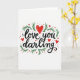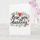 This I love you greeting card centers the words “love you darling” in black, written in a flowing, cursive-style lettering. Around the message, green leafy sprigs curve in from the sides and corners like a gentle frame. Red hearts are sprinkled throughout, with one larger heart tucked into the word “love” and many smaller hearts scattered nearby. The background is plain white, so the black text, green leaves, and red hearts stand out clearly. The hearts feel like little bursts of affection, and the leaves add a calm, cozy touch. It feels meaningful to give because it says exactly what you want to say, without needing anything extra 🥰. Whether it’s for a partner or someone you care about, it lands as warm and sincere ❤️. Hope it helps you share Valentine’s Day sentiments in a kind, simple way.