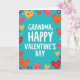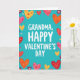 This greeting card centers on the message “GRANDMA, HAPPY VALENTINE’S DAY” in large white letters near the middle. The lettering looks like a friendly sans‑serif style, and it stands out clearly against a bright teal background. Around the words, a border of hearts wraps the design like a frame, with hearts in red, pink, orange, and yellow. Some hearts have little patterns inside, like tiny hearts or speckles, which makes them feel extra thoughtful. Small purple flowers are scattered between the hearts to add a gentle, sweet touch. The overall look feels happy and affectionate, like a warm hug meant just for Grandma 🥰. It’s a meaningful card to give because the message is direct and loving, and the surrounding hearts make the care feel easy to see ❤️. Hope it helps you share Valentine’s Day sentiments in a kind, simple way.