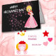 A pretty little blonde princess in a pink gown holds a red heart on the front of this kids' Valentine card. Behind her is a cascade of glowing pink hearts. The text in white at the top left corner says "Happy Valentine's Day!" Everything is placed on a dramatic black background. The inside of the card has more text fields for you to customize, plus additional images, including a royal coach, a heart decorated gold crown, stars and hearts. Cute for the little princess in your life! *GRAPHICS by PremiumClipart © Premiumclipart.com.