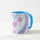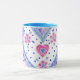 A pretty and romantic ringer mug with a powder blue rim and handle and a design of pink and blue roses and hearts, from an original gouache painting by Judy Adamson. This design is also available on greeting cards and various gifts.