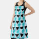 This graphic design, seems to glow, with black hearts, upon white squares-displayed on abstract, chequerboard pattern, of turquoise, shaded with blue.