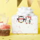 Charming penguins adorned with hats and scarves playfully dance amidst a backdrop of festive snowflakes, spreading cheer and warmth to your presents.