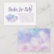 Dreamy heaven sent theme baby shower book request card featuring watercolor illustration of pink and purple cloud. The card asks guests to bring in a new or used children's book instead of a card.