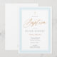 An elegant baptism invitation featuring a classic gold cross and soft blue borders.