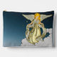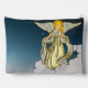 The angel features a serene expression with delicate, flowing golden hair, embodying grace and tranquillity. The use of gold and soft yellows gives the angel a luminous, almost divine quality, highlighting its otherworldly presence. The detailed and expansive wings add a sense of grandeur and protection, emphasizing the angel's role as a guardian. The elegant, flowing robes add movement to the design, creating a dynamic and lifelike appearance. The angel is set against a backdrop of clouds and stars, enhancing the celestial theme and adding depth to the composition. The overall demeanour and gentle posture of the angel symbolize peace, comfort, and protection, making it a calming and uplifting image.