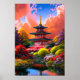 Discover a slice of paradise as a tall Japanese pagoda stands amidst a breathtaking display of stunning flora. The sky above is adorned with pink clouds, casting a serene and dreamy ambiance. Lose yourself in this haven of beauty, where the pagoda and nature harmonize in perfect elegance.