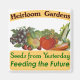 Heirloom Gardens Seed of Yesterday, Feeding the Future gardener saying for vintage fruit and vegetable seed savers and growers. In retro and futuristic letters with grapes, pear,tomato, carrots and corn.