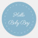 Blue "hello baby boy" theme boy baby shower and baby gift stickers white on blue.