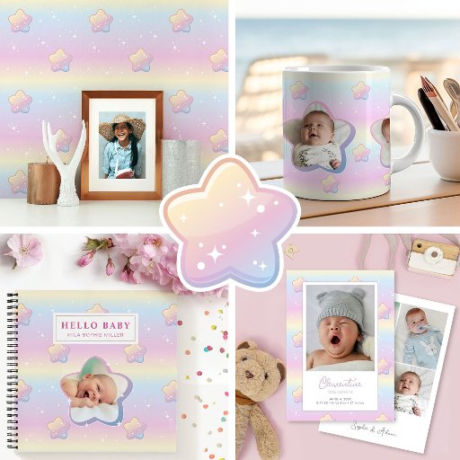 Announce the arrival of your little one in a truly magical way with our collection of birth announcement items, featuring a vibrant rainbow-coloured background adorned with sparkling stars. Each piece in this collection is designed to celebrate the joy and wonder of your new addition, providing a beautiful and memorable way to share the news with loved ones.