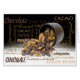 The cover design is adorned with chocolate bits and almonds spilling from a black ramekin with a horizontal black and white background and a text block of the words chocolate, dark chocolate and almonds in English, German and French plus more words in a variety of font styles, sizes and colours. Customize the inside greeting with your message or remove the text.