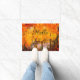 Ce tapis porte une magnifique scène d'automne sur une crique avec les mots HELLO FALL au milieu.