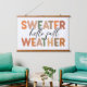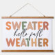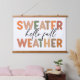 This vibrant fall artwork perfectly captures the cozy essence of the season with its playful typography and warm colour palette. The design features the bold phrase "Sweater Weather" in large, blocky letters that alternate in shades of orange, beige, green, and brown, evoking the changing colours of autumn leaves. The phrase "hello fall" is nestled in between, written in a flowing, cursive script that adds a touch of elegance and warmth to the design.