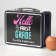 Hello First Grade, Back To School Metal Lunch Box. Customize it with your name for a chic girly unique look.