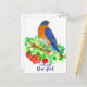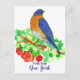 A "Hello from New York" post card decorated with a bluebird on a blooming branch with red orange roses illustrated with ink and watercolor. Inspired by the state bird and state flower of New York. You can edit or remove the text to fit your needs.
