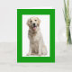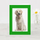 Aww who can resist the sweet face of a happy Golden Retriever puppy dog? This fun Hello greeting card features a blonde yellow Golden Retriever pup sitting on a white background with a green frame.
