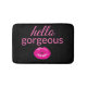 Glam up your bathroom decor with this custom "Hello Gorgeous" Bath Mat. This design features an image of glossy pink lips along with pink font set against a black background.