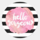 Hello Gorgeous Black Stripe & Pink Watercolor Classic Round Sticker