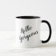 Hello Gorgeous handletter typography coffee mug. Cute black and white drink cup with handwritten font. Custom drinkware with handlettering calligraphy. Birthday and Christmas gift ideas for girlfriend, wife, friend, bride, co worker etc. Great for office or home. Editable template. Double sided print.