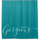 This shower curtain features modern hello gorgeous text in white colour on teal background.