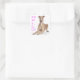This fun canine sticker features a portrait of a happy tan and white Greyhound puppy dog with a hello greeting printed in a purple heart font highlighted against a crisp white background.