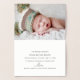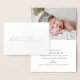 Modern elegant birth announcement featuring the words "hello little one" in a modern script in real foil on the front, optional line underneath (customize or delete field if desired) and birth info along with a photo inside.