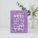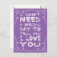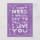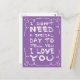 This sweet postcard features the quote: "I don't need a special day to tell you I love you" handpainted in a fun white font highlighted by a cute heart swirly frame with a vibrant purple background. The back of the postcard is blank for your personal note.