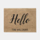 Welcome your guests with this rustic burlap background door mat with your family name and a black typography "hello".